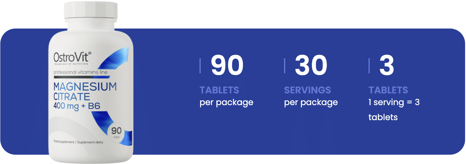 OstroVit Magnesium Citrate 400 mg + B6 هو مكمل غذائي في شكل أقراص سهلة الابتلاع، يحتوي على المغنيسيوم في شكل صفير (citrate) عالي الامتصاص بالإضافة إلى فيتامين B6. تم تصميمه لدعم توزيع الطاقة والوظائف العصبية والمناعية، خاصةً لمن يعيش حياة نشطة سواء بدنيًا أو ذهنيًا .