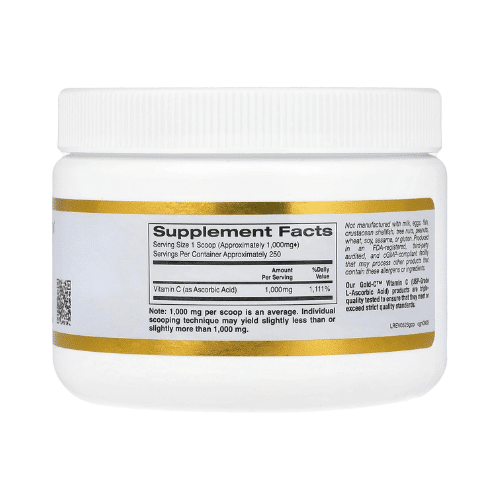 Vitamine C en poudre de haute qualité signée California Gold Nutrition. Formule à base d’acide ascorbique pur, dosée à 1000 mg par portion. Facile à diluer, idéale pour soutenir l’immunité et réduire la fatigue.